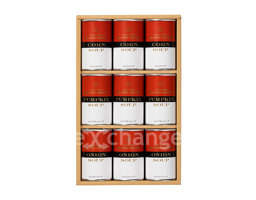 セット内容 | コーンスープ160g×3缶・パンプキンスープ160g×3缶・オニオンスープ160g×3缶 |