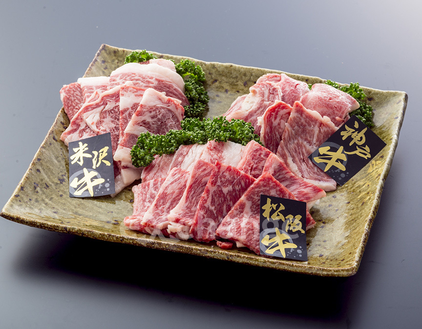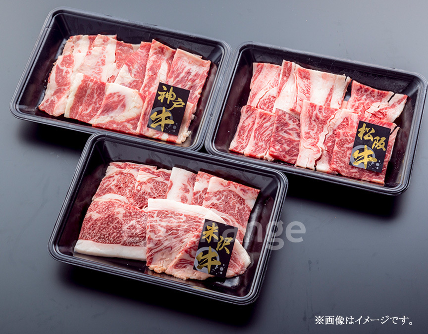 【松阪牛】松阪肉は、霜降りがきめ細かく、綺麗に入っていることはもちろん、肉質が柔らかく、霜降りの脂肪分に甘みのある風味が特徴で、長期飼育の中で厳選された飼料による行き届いた管理があってこそ生まれる肉の芸術品です。 【神戸牛】世界の認めるブランド、神戸ビーフの濃厚な旨味と、やわらかな肉質がまろやかな風味を一層際立たせている逸品です。 【米沢牛】山形県産黒毛和牛の米沢牛は、米沢盆地の気候風土と最上川源流域の豊かな水資源に恵まれ、豊かな香りとほどよい溶け具合の旨味がある食べて美味しい米沢牛です。