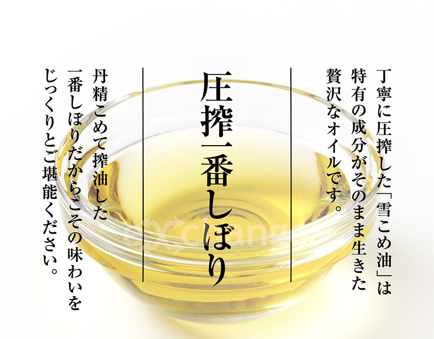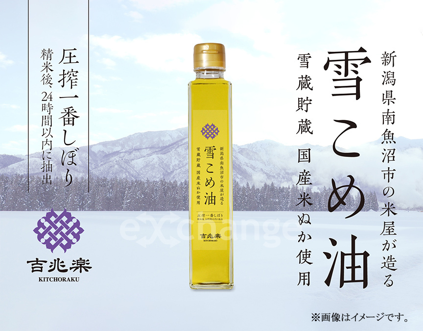 新潟県南魚沼市の米屋が造る雪こめ油。雪で貯蔵された米から鮮度抜群の米ぬかが出来上がりました。精米後24時間以内に圧搾抽出したこめ油は、自然由来の味わいを楽しめる、抗酸化成分が豊富でからだに優しい逸品です。揚げ油としては勿論、ドレッシングやそのままの生食でもお召し上がり頂けます。