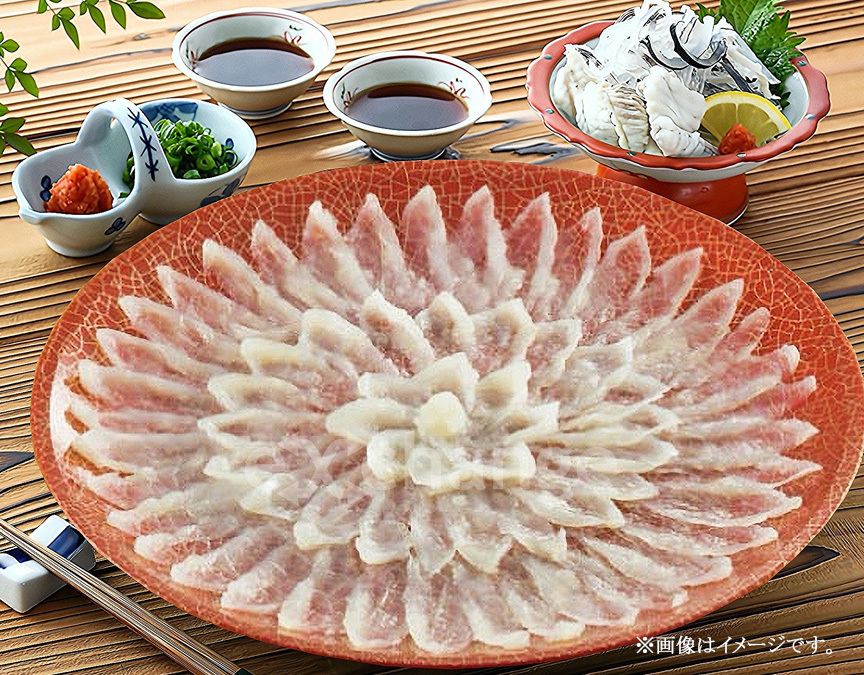 ふぐの王様とらふぐに、ひけをとらない美味しさのふぐの女王と呼ばれるまふぐを、ふぐの取扱い日本一の下関唐戸魚市場の南風泊市場で厳選して競り落とし、熟練のふぐ処理師の手技で、一切れずつ丁寧に菊花のように盛りつけました。ふぐ刺しの淡白で上品な味わいともっちりとした食感をご堪能いただけます。