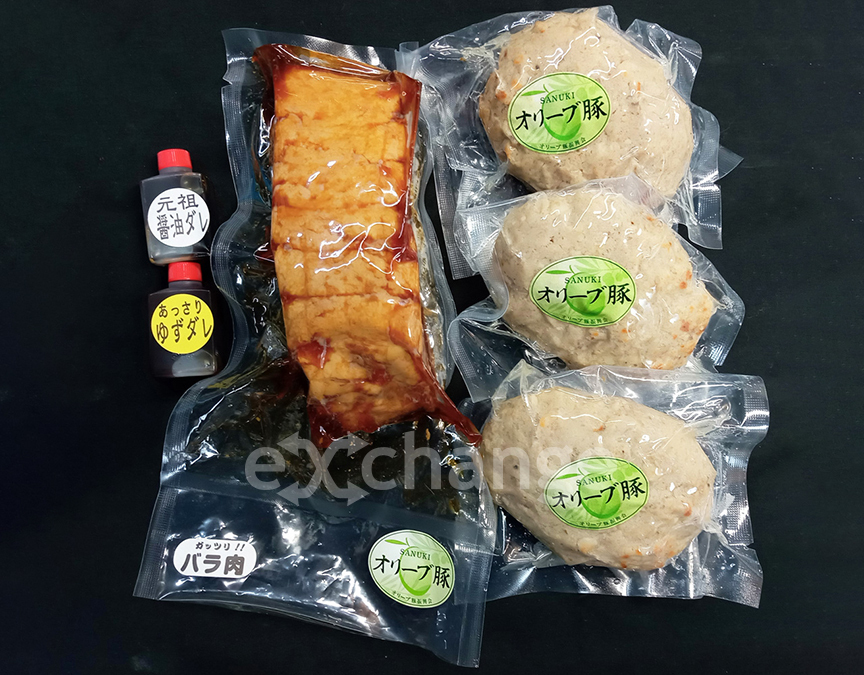 セット内容 | オリーブ豚バラチャーシュー255g、元祖醬油ダレ15g、あっさりゆずダレ15g、オリーブ豚手作りハンバーグ110g×3 |