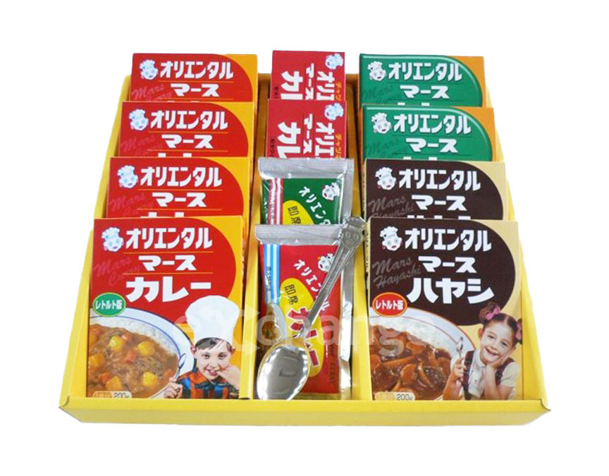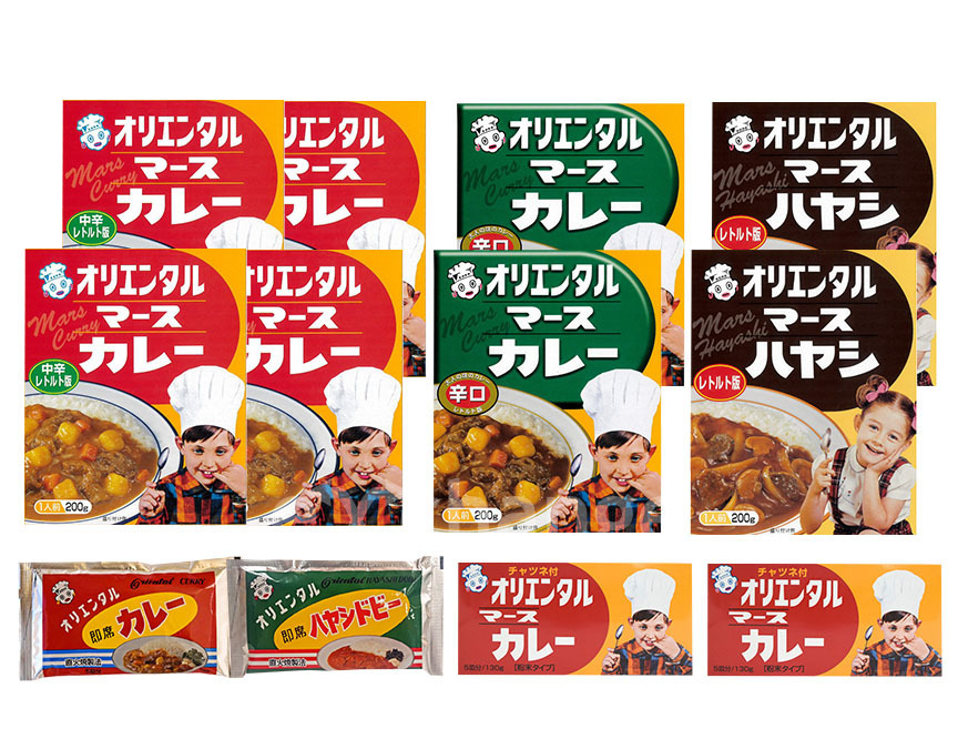 現在も日本最長寿のカレールウとして販売されている【オリエンタル即席カレー】と、姉妹品の【即席ハヤシドビー】、チャツネ付きの【マースカレー】、人気のレトルトシリーズ【マースカレーレトルト版】【マースカレーレトルト版辛口】【マースハヤシレトルト版】、オリエンタル坊や【オリジナルスプーン】をセットにしました。
