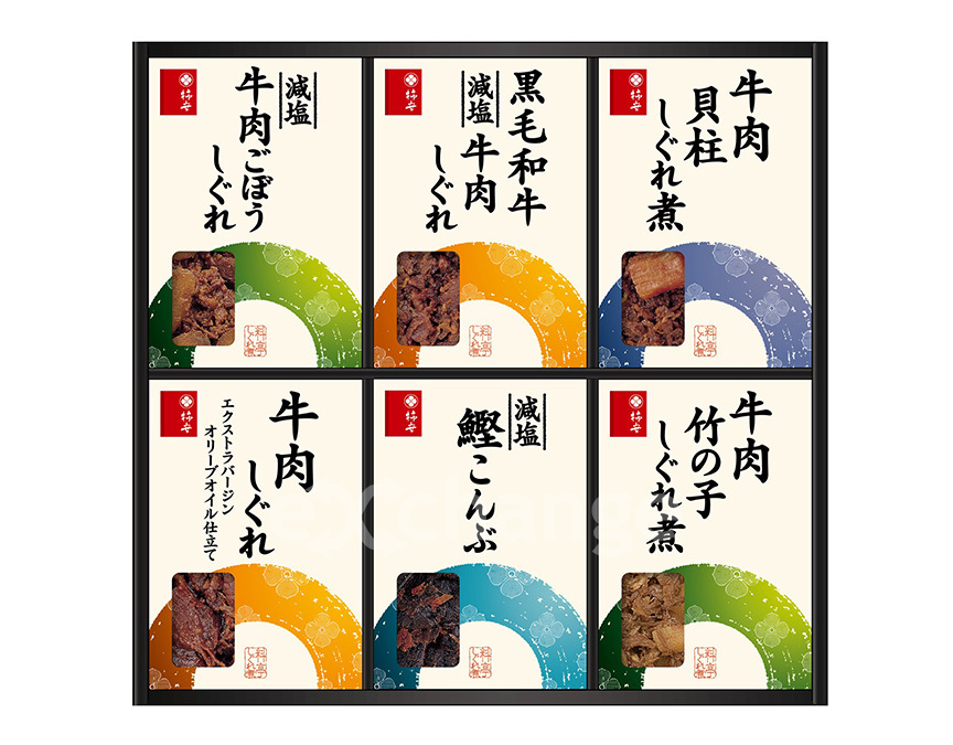 セット内容 | 黒毛和牛減塩牛肉しぐれ、牛肉しぐれエクストラバージンオリーブオイル仕立て、減塩牛肉ごぼうしぐれ、牛肉貝柱しぐれ煮、牛肉竹の子しぐれ煮、減塩鰹こんぶ各50g |