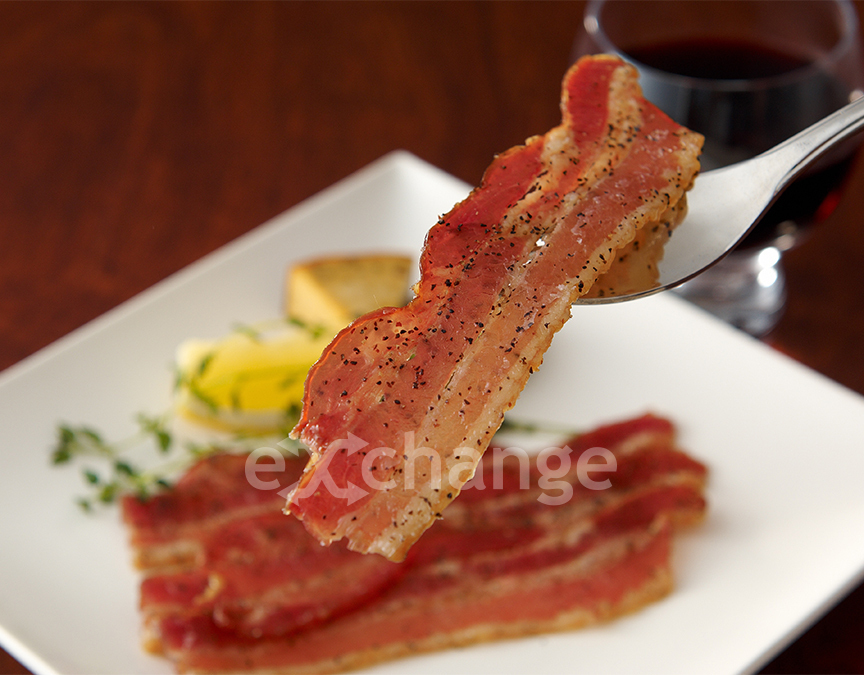 おつまみベーコン:豚ばら肉の脂身の甘さに粗挽き黒こしょうとスモークの香りが調和した商品です。
