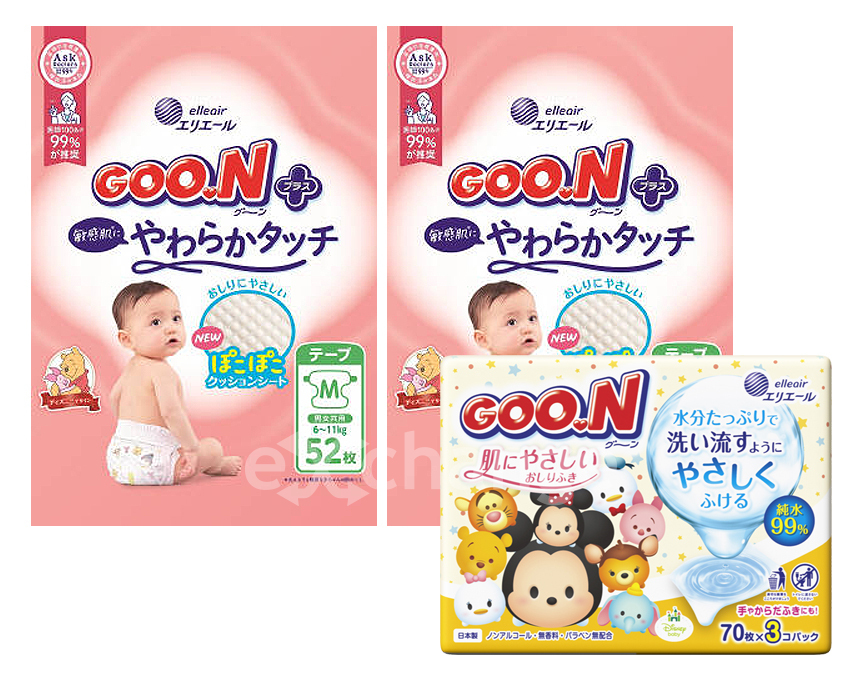 | セット内容 | グーンプラス敏感肌にやわらかタッチMサイズ52枚×2個、グーン肌にやさしいおしりふき70枚3P×1個 |