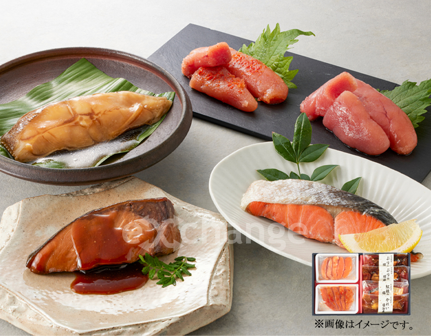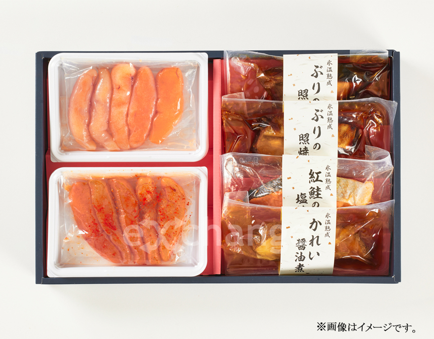 | セット内容 | 辛子明太子150g×1、あごだしうまみたらこ150g×1、かれい醤油煮100g×1、紅鮭塩焼き60g×1、ぶりの照焼き90g×2 |