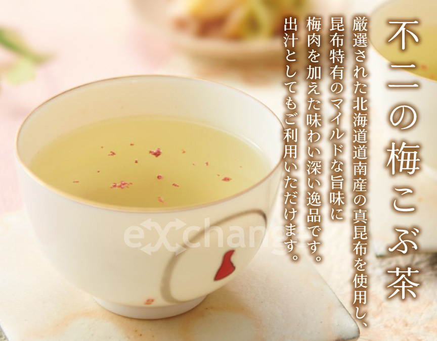不二の梅こぶ茶は、北海道道南産の真昆布を使用した味わい深い飲み物です。昆布茶のマイルドな口当たりに、きりっと梅の酸味が加わった定番の味。昆布屋が作る本物志向の梅こぶ茶で、ほっとした時、お祝い事やお喜び事にもご利用頂けます。個包装タイプは持ち運びしやすく、オフィスの息抜きにも最適です。 昆布には、うまみ成分「グルタミン酸」が多く含まれています。飲用はもちろんですが、お料理の隠し味としても使える万能調味料です。和食・洋食・中華を問わず、様々なお料理にお使い頂けます。
