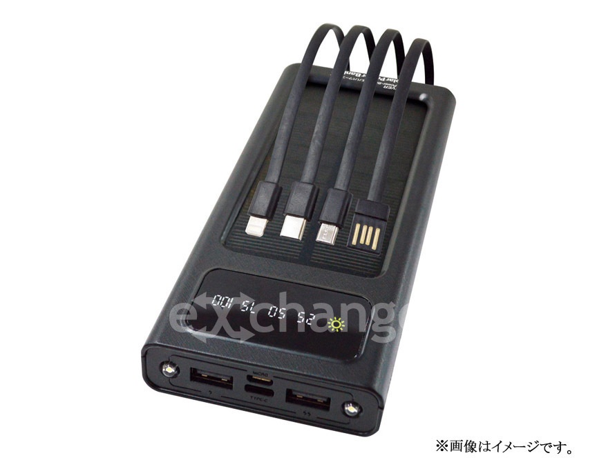 充電入出力ケーブル4本内臓!安全性の高いリチウムイオンポリマー電池採用。大容量10000mAhで最大5台同時に充電可能。太陽光、照明でフル充電状態にしておけば。いつでもすぐ使えて便利。非常時、アウトドアに便利な2灯式LEDライト付き。