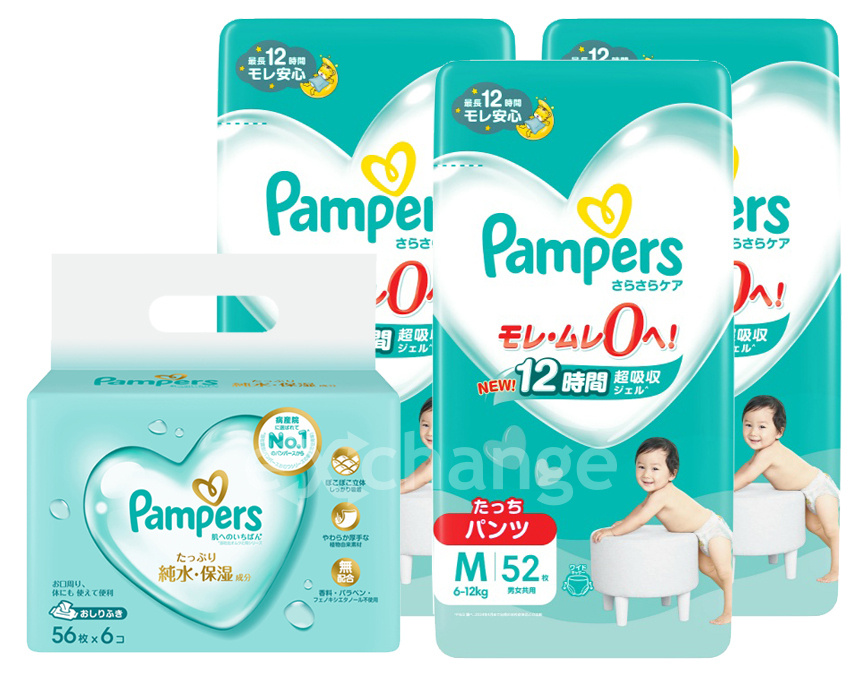 | セット内容 | パンパース さらさらケア パンツ スーパ-ジャンボ Mたっち52枚×3個、パンパース 肌へのいちばん おしりふき(56枚×6P)×1個 |