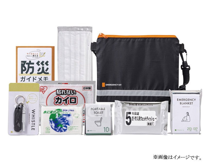 | セット内容 | エマージェンシーサコッシュ(約215×175㎜)×1、水に流せるポケットティッシュ・携帯トイレ(1回分)・使い捨てカイロ・使い捨てマスク・防災ガイドメモ・非常用呼子笛(IDカード付き)・ウェットティッシュ(5年保存)・静音アルミブランケット×各1 |