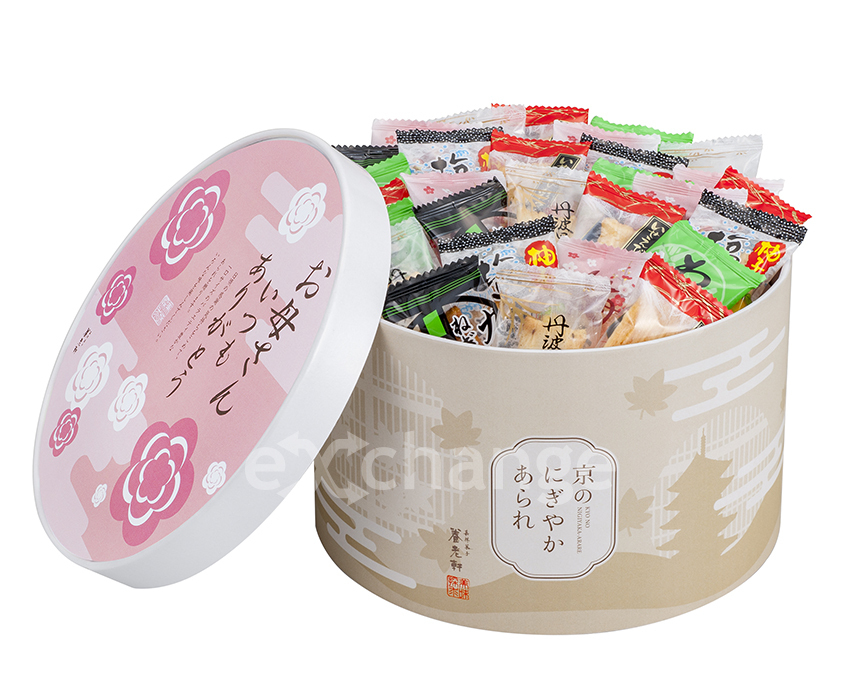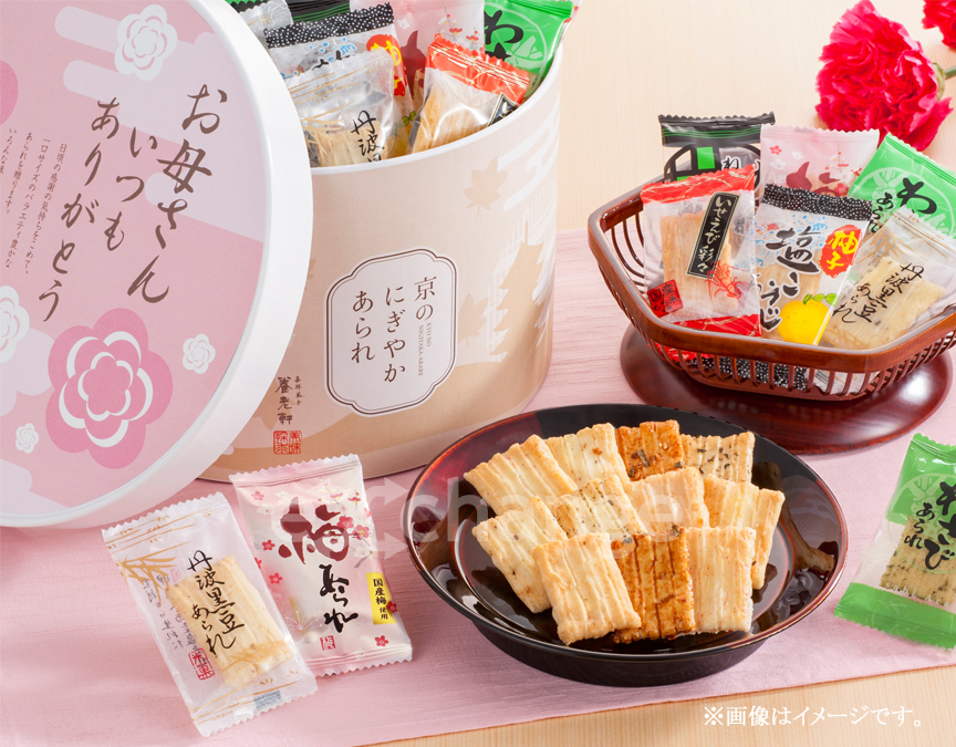 感謝の気持ちが伝わる可愛いパッケージに、色んな味のあられをいっぱい詰め込みました。母の日のメッセージをつけてお届けいたします。