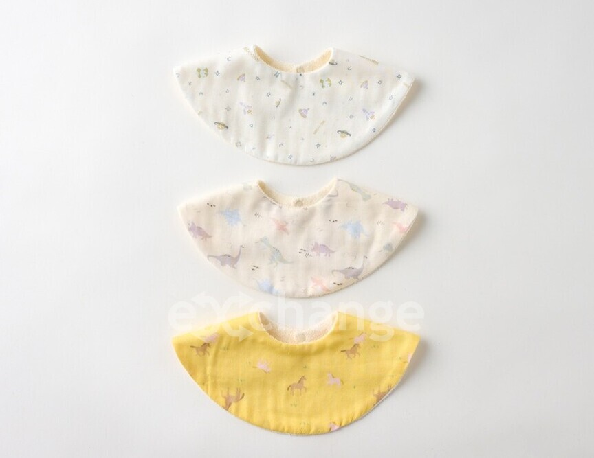 赤ちゃんらしさとおしゃれさを兼ね備えた、やさしい色味のデザインで、宇宙柄・きょうりゅう柄・うま柄の3枚セットです。