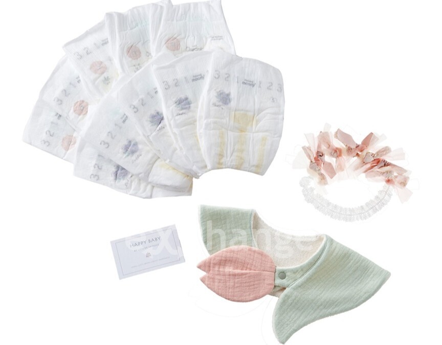 | セット内容 | スタイ×1、カチューム(ヘアバンド)×1、ガーゼケット×1、おむつSサイズ(4〜8kg)×10枚 |