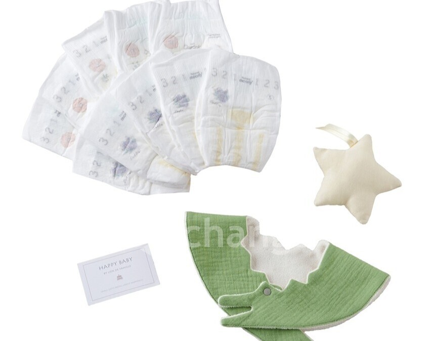 | セット内容 | スタイ×1、ラトル×1、ガーゼケット×1、おむつSサイズ×10枚 |