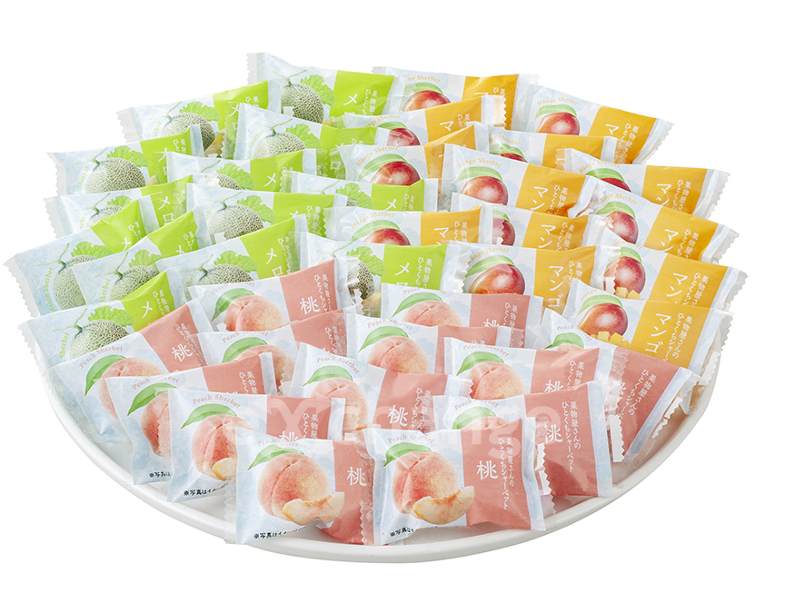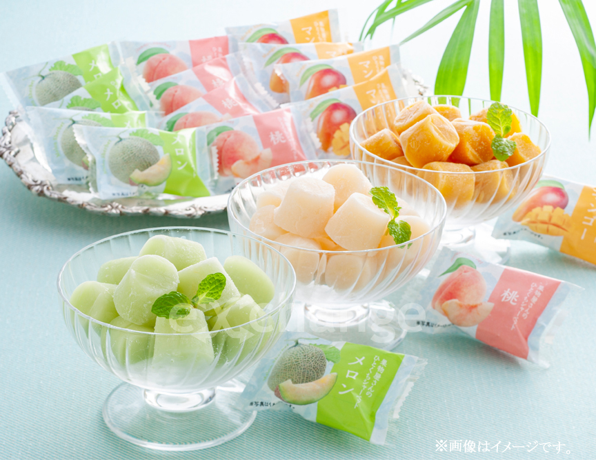 岡山の果物専門店「吉英フルーツ」おすすめのひと口サイズのシャーベット。メロン・桃・マンゴーのおいしさを詰め込んだ風味いっぱいのアイスギフトです。