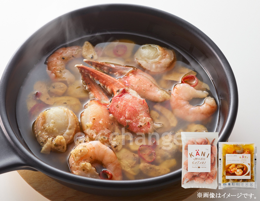 「1本爪」は部位のなかでもっとも身がしまっているとされる蟹の爪の部分だけを集めました。ほかのどの部位よりも、プリプリとはじけるような食感が特徴ですが、フライなど火を通すと、身がふっくらフワフワな食感になります。蟹らしいフォルムで、どんなお料理にしても豪華さを引き出してくれる商品。贈り物としても大変人気があります。 「シーフードアヒージョ」は、1本爪の独特の甘味、旨味を生かしながら他に、エビ・ホタテ・アサリを入れ具沢山な本格的なシーフードアヒージョに仕上げました。 味つけはシンプルに、ニンニク、オリーブオイル、塩。 そのまま召し上がって頂いてもいいですし、バケットをつけたり、パスタと絡めますとペペロンチーノ風になります。
