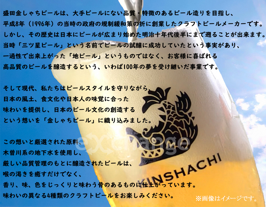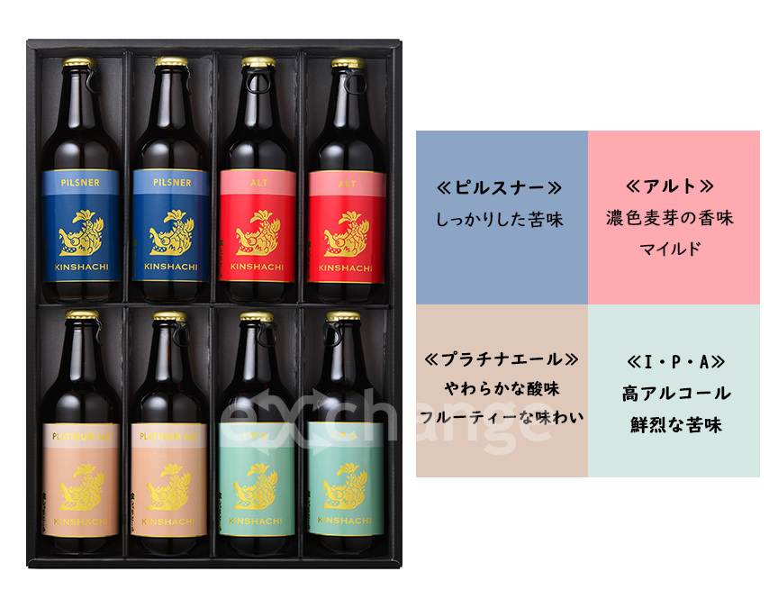 | セット内容 | 金しゃちビールピルスナー330ml、金しゃちビールアルト330ml、金しゃちビールプラチナエール330ml、金しゃちビールIPA330ml各2本いずれも瓶 |