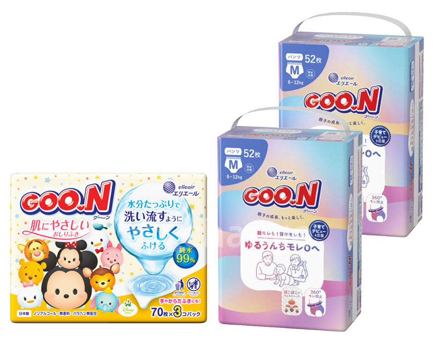 | セット内容 | グーン ゆるうんちモレ0へ パンツ Mサイズ 52枚×2個、グーン肌にやさしいおしりふき(70枚×3パック)×1個 |