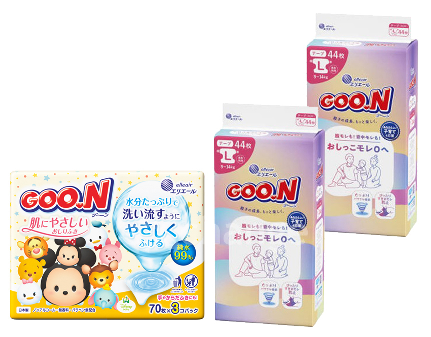 | セット内容 | グーン おしっこモレ0へ Lサイズ44枚×2個、グーン肌にやさしいおしりふき(70枚×3パック)×1個 |