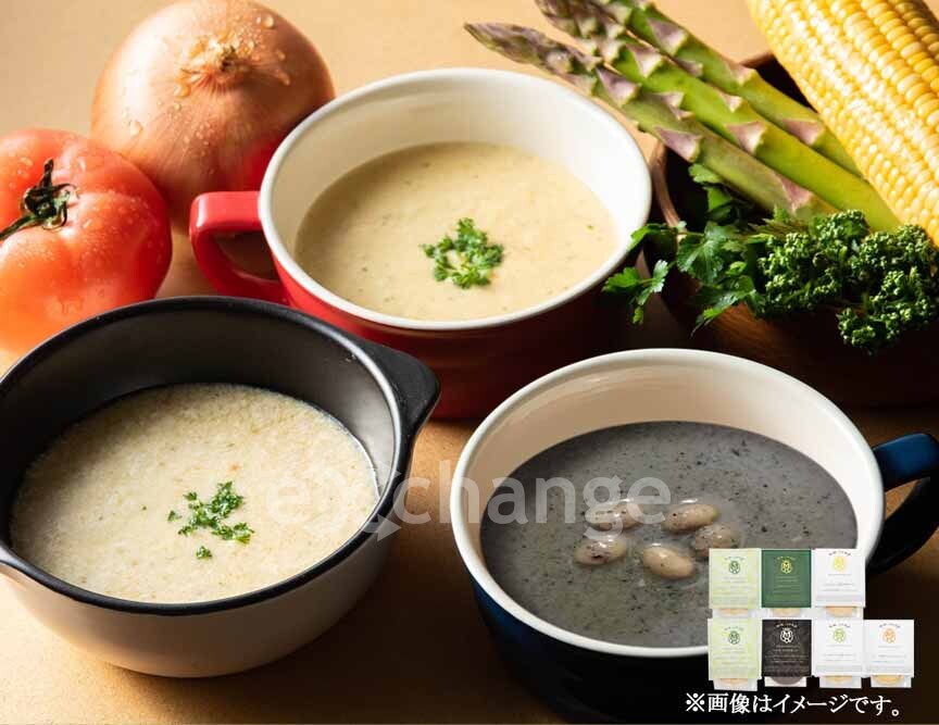 | セット内容 | 蓮根とほうれん草のグリーンポタージュ180g×2、たっぷり蓮根とゆずのポタージュ180g、ふっくらミヤギシロメ大豆と黒ごま豆乳スープ180g、とうもろこしの贅沢ポタージュ180g、アスパラガスと玉葱のポタージュ180g、とろーり濃厚かぼちゃのスープ180g |
