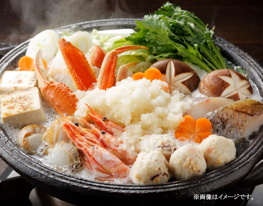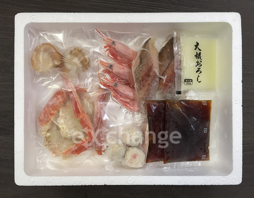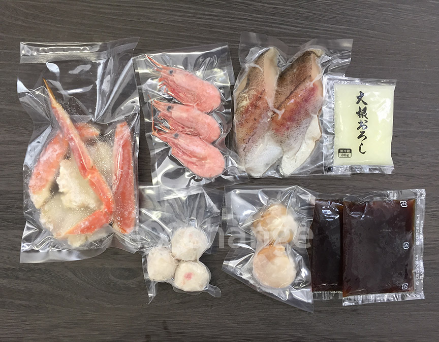 | セット内容 | ゆでずわいがにカット100g×1、ボイル海老6g×3、ボイル帆立20g×2、たこ入つみれ15g×3、助宗鱈切身40g×2、大根おろし30g×1、たれ(濃縮醤油仕立て)50ml×2 |