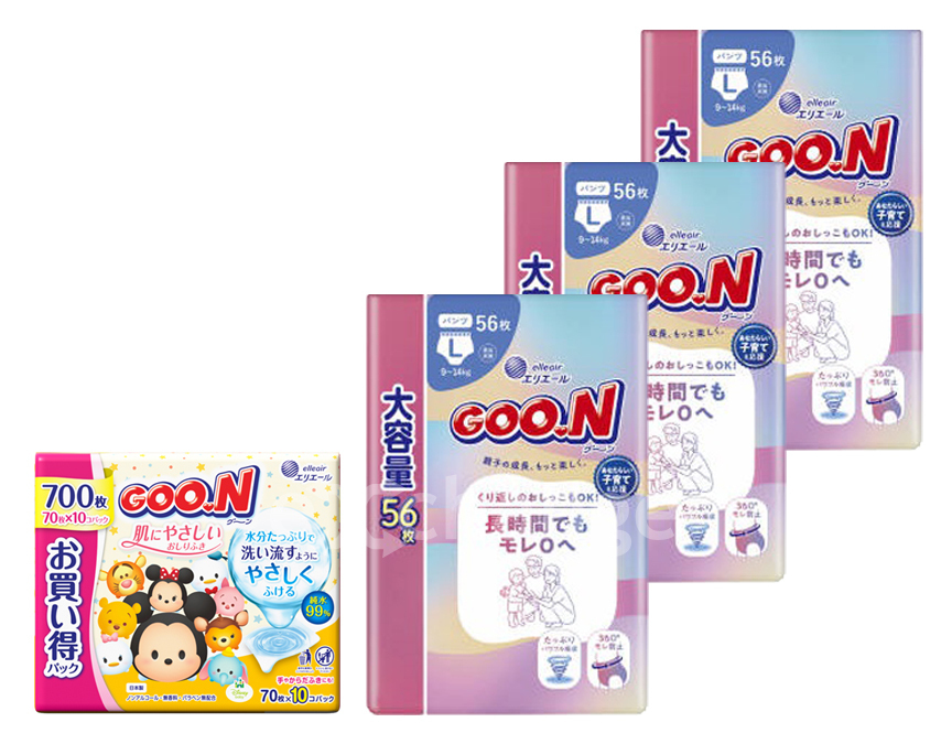 | セット内容 | グーン 長時間でもモレ0へ パンツ Lサイズ 56枚×3個、グーン肌にやさしいおしりふき(70枚×10パック)×1個 |