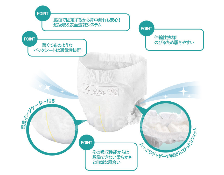 赤ちゃんの肌への負担をできるだけ減らすために作られた紙おむつです。